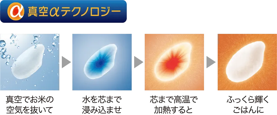 Thơm ngon và tiết kiệm thời gian nhờ tính năng thông minh của công nghệ hút chân không. Ngon ngay cả khi lạnh. Không khí trong nồi được thoát hoàn toàn, chênh lệch áp suất giúp hạt gạo nhanh chóng hút ẩm vào lõi nồi. Nó cũng nhanh chóng và dễ dàng sử dụng các loại hạt hoặc gạo lức, lúa mạch, hoặc hạt không hấp thụ, cũng được nấu chín đến tận lõi.